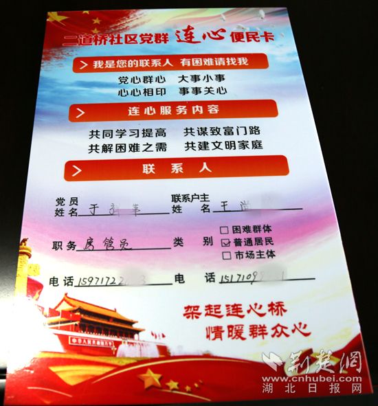 在走訪調(diào)研過(guò)程中,針對(duì)社區(qū)居民反映“通訊條件越來(lái)越好,干群聯(lián)系卻越來(lái)越少”等問(wèn)題,在社區(qū)尖刀班班長(zhǎng)廖遠(yuǎn)明的建議下,二道橋社區(qū)推出社區(qū)黨群“連心”便民卡聯(lián)系制度,聯(lián)系卡上印有下沉社區(qū)黨員干部,社區(qū)大黨委成員,社區(qū)治理尖刀班成員姓名,聯(lián)系電話,服務(wù)內(nèi)容。