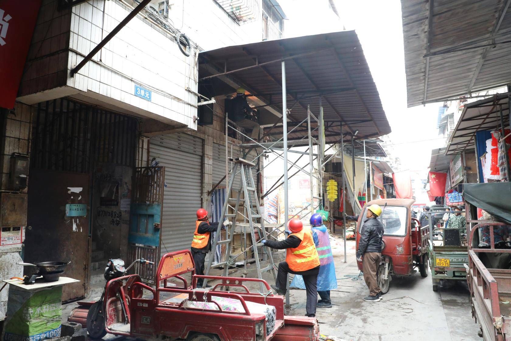 雨天貨物受損、高處墜物危險......拆除掉鋼棚以后,這些問題商戶們尤為擔(dān)心。經(jīng)過各部門的共同商議,決定統(tǒng)一為商戶們搭建1.5米標(biāo)準(zhǔn)化雨棚,既不影響消防通道,又能保障商戶安全正常的營業(yè)環(huán)境。