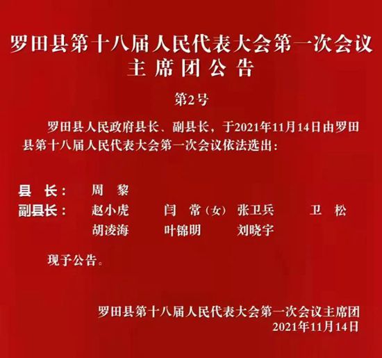 荊楚網(wǎng)(湖北日報(bào)網(wǎng))訊(通訊員顏紅勝、陳欽)羅田縣第十八屆人民代表大會第一次會議,選舉產(chǎn)生新一屆縣政府領(lǐng)導(dǎo)班子,周黎當(dāng)選羅田縣人民政府縣長,趙小虎、閆常、張衛(wèi)兵、衛(wèi)松、胡凌海、葉錦明、劉曉宇當(dāng)選為羅田縣人民政府副縣長。