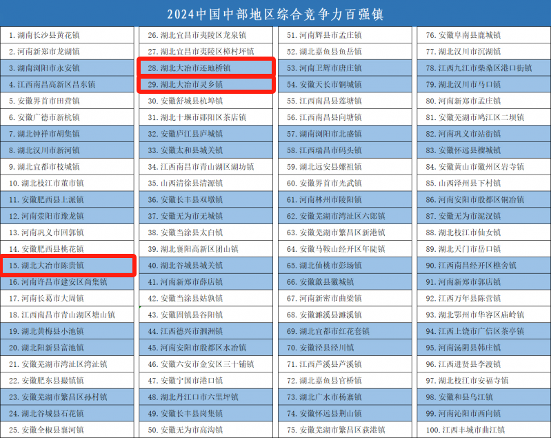荊楚網(wǎng)(湖北日?qǐng)?bào)網(wǎng))訊(記者左乙辰 通訊員 陳向東 羅蒙 范國(guó)安)近日,2024年鄉(xiāng)鎮(zhèn)高質(zhì)量發(fā)展交流會(huì)在湖南長(zhǎng)沙召開,會(huì)上揭曉了2024年中國(guó)中部地區(qū)綜合競(jìng)爭(zhēng)力百強(qiáng)鎮(zhèn)名單,大冶市陳貴鎮(zhèn)、還地橋鎮(zhèn)、靈鄉(xiāng)鎮(zhèn)上榜,分列第15、28、29位。