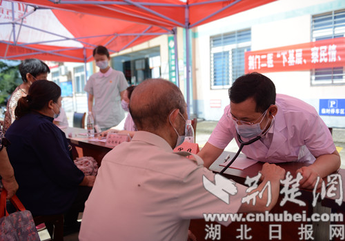 6月24日,在東寶區(qū)栗溪鎮(zhèn)衛(wèi)生院義診現(xiàn)場,74歲的村民杜安亮向參加義診的荊門二醫(yī)院長李軍華表述了不適后,身為消化內(nèi)科專家的李軍華專業(yè)地拿起聽診器,起身前傾認(rèn)真為老人聽診、問診,叮囑其一定要抽時間去上級醫(yī)院做心臟彩超和胃腸鏡,并交待了生活中的注意事項和一些健康保健常識。