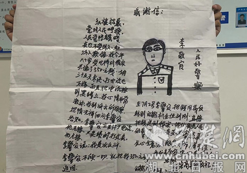 “這是我畫的人民警察,信也是我寫的,就想對(duì)警察同志表示感謝!”7月18日上午,一名80歲老奶奶拿著一封自己手寫的感謝信來到團(tuán)林派出所,感謝民警幫她拿回350元錢。經(jīng)了解,老奶奶早前將錢借給了一個(gè)朋友,現(xiàn)在卻聯(lián)系不上了。值班輔警李興森接到老奶奶的求助后,通過查詢,迅速聯(lián)系上了這名朋友,并于7月3日將350元錢送到了老奶奶手里,老奶奶接過錢時(shí)連連對(duì)他表示感謝。
