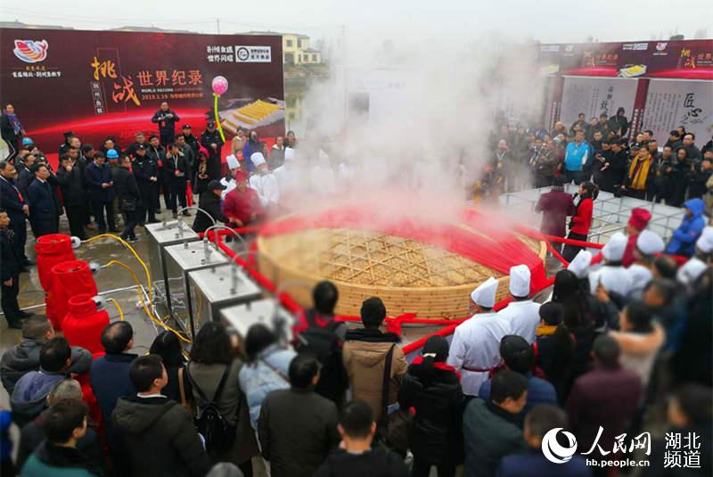 19日上午10時(shí)43分,在現(xiàn)場(chǎng)近千名觀眾和觀看網(wǎng)絡(luò)直播的上百萬網(wǎng)友的共同見證下,28名挑戰(zhàn)隊(duì)員通力合作,歷時(shí)一個(gè)小時(shí)的蒸制,“荊州魚糕”終于“出籠”。 經(jīng)世界紀(jì)錄認(rèn)證機(jī)構(gòu)(WRCA)認(rèn)證官的現(xiàn)場(chǎng)測(cè)量,本次荊州魚糕以直徑4米,面積達(dá)12.56平方米的成績(jī),刷新了“天下第一糕”的世界紀(jì)錄。
