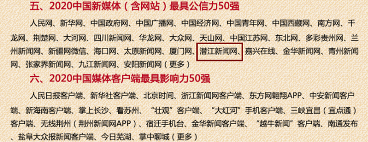 潛江新聞網(wǎng)是由中共潛江市委宣傳部主管,潛江市網(wǎng)絡(luò)新聞中心主辦,作為潛江市域內(nèi)唯一具有互聯(lián)網(wǎng)新聞采編發(fā)布資質(zhì)的新媒體單位,該網(wǎng)站近年緊緊圍繞市委、市政府中心工作,充分發(fā)揮網(wǎng)絡(luò)媒體的優(yōu)勢(shì),及時(shí)、全面、系統(tǒng)地深入報(bào)道,在推進(jìn)潛江重大主題宣傳,引導(dǎo)網(wǎng)上輿論,及時(shí)應(yīng)對(duì)突發(fā)事件,提供公共信息服務(wù)等方面發(fā)揮了極其重要的作用。網(wǎng)站曾獲得鄂豫陜渝十大特色新聞網(wǎng)站、全國地方網(wǎng)絡(luò)媒體最具創(chuàng)新力品牌20強(qiáng)、最具價(jià)值品牌20強(qiáng)、十大縣級(jí)最具影響力品牌、現(xiàn)場(chǎng)云優(yōu)秀融合獎(jiǎng)、中國新聞網(wǎng)站最具公信力50強(qiáng)等獎(jiǎng)項(xiàng),其生產(chǎn)的新聞、專題等在國家、省級(jí)評(píng)選中屢獲殊榮。