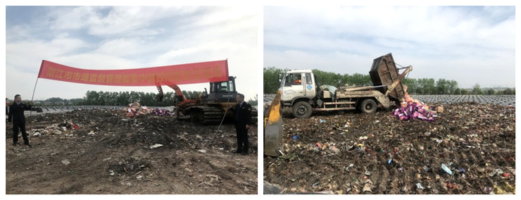 4月16日上午,潛江市市場監(jiān)督管理局執(zhí)法人員在位于楊市辦事處的潛江市垃圾處理場采取壓縮、碾壓、深埋等方式集中銷毀收繳的3604.7公斤問題食品,涉及假冒偽劣食品、過期食品、“三無”食品、“五毛”食品等。