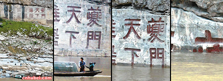 昨日上午,瞿塘峽夔門摩崖題刻中的“踏出夔巫打走倭寇”字開始沒入江中。夔門摩崖題刻頂端的水位線是126米,蓄水完后,這些字跡會被全部淹沒。當(dāng)?shù)夭块T已對這些文物進行了保護。 湖北日報記者周立新攝