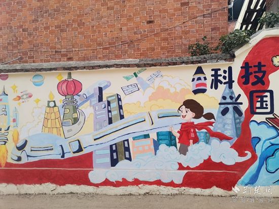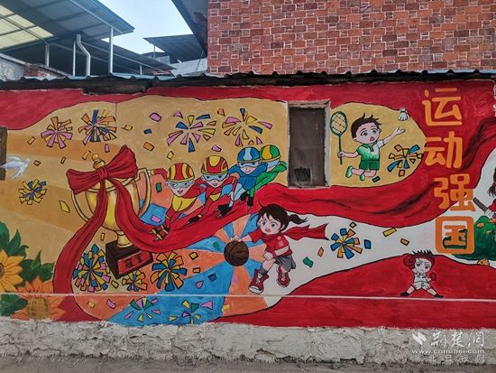 這面墻體上繪制了沐浴黨恩、運動強國、生態(tài)文明、科技興國、與黨同行、向黨向未來六大主題,其中既有充滿活力、朝氣和正能量的向日葵、麥穗、綠樹等植物,又有熊貓、猴子、兔子、獅子等可愛的動物。