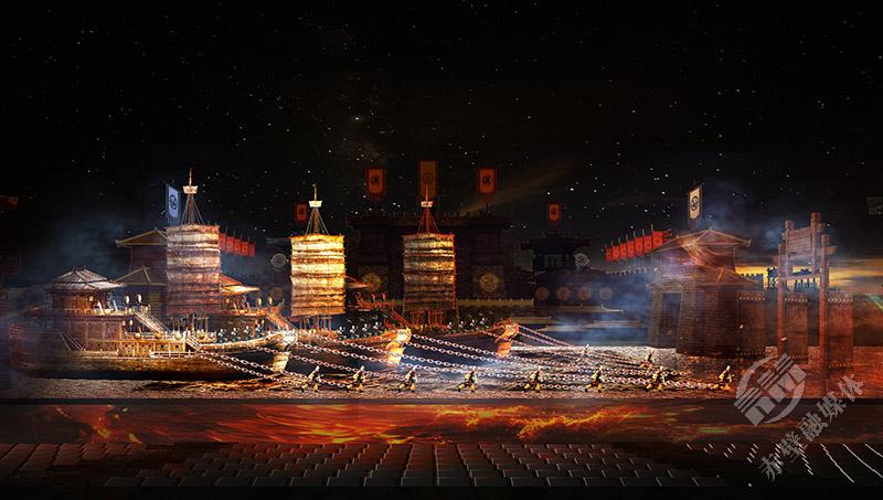 2000多年前,諸葛亮借的東風(fēng),是摧枯拉朽、克敵制勝的戰(zhàn)火雄風(fēng);2000多年后,三國赤壁古戰(zhàn)場借的東風(fēng),則是凝心聚氣、砥礪奮進的時代之風(fēng)。演出將赤壁之戰(zhàn)這盤歷史大棋置于天地之間,以三國群雄為弈者,以演員和觀眾為棋子,利用光影特效與舞美裝置的變換,將戰(zhàn)役的多個關(guān)鍵情節(jié)進行藝術(shù)化提煉與重構(gòu),運用聲、光、電等現(xiàn)代舞美技術(shù),將歷史與現(xiàn)實、虛擬與真實融為一體,構(gòu)建起一個戰(zhàn)火紛飛、羽箭穿空的三國世界,讓赤壁之戰(zhàn)從史書中的符號躍升為可觸摸、可參與的精神場域。