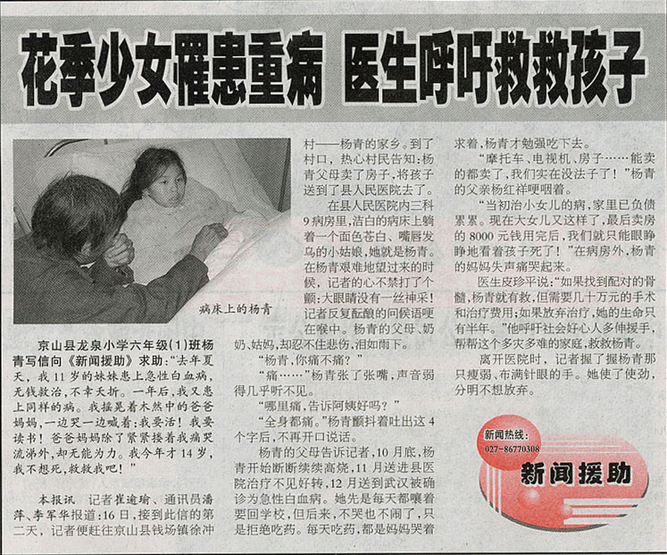 京山縣一對先后患上急性白血病的少女,妹妹已于一年前不幸夭折,姐姐楊青在死亡線上苦苦掙扎。父母為治療姐妹倆的病,花光了所有積蓄,仍不能湊夠移植骨髓所需的幾十萬元手術和治療費用,已經(jīng)陷入絕望。但是,才14歲的楊青不肯向悲慘的命運妥協(xié),她寫信給報社:“我不想死,我要讀書,救救我吧!”
